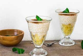 - Cortamos la piña en taquitos pequeños y disponemos un poco en el fondo del vaso, o copa, que vayas a utilizar. Encima ponemos unas cucharadas de la tapioca y decoramos espolvoreando con un poco de canela y cilantro molidos.