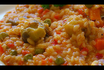 - Agregamos luego el arroz, tapamos la olla y cocinamos a fuego lento por aproximadamente 15 a 20 minutos, revolvemos una o dos veces al comienzo para evitar que el arroz se acumule en la parte superior, mientras tanto lavamos y cortamos las verduras.