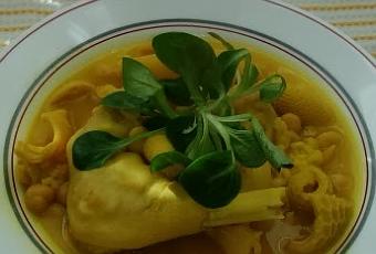 Esta es una receta de La región de Murcia, ya hace bastantes años que la elaboro ya que unos amigos nuestros de fortuna me la pasaron ya que nos gustó tanto. La verdad que está buenísimo. INGREDIENTES: 2 tripas de cordero cortaditas a trocitos no muy grandes 6 patitas de cordero abiertas por la mitad 250 g de garbanzos puesto en remojo la noche antes Un hueso de jamón 1 pastilla de caldo de carne Colorante alimenticio Arroz 2 patatas Agua sal ELABORACION: En una olla añadiremos los garbanzos cubiertos de agua, como media olla añadiremos el hueso de jamón la tripa las patitas de cordero y la pastilla de caldo y el colorante dejaremos que valla hirviendo a fuego medio durante dos horas. Bajaremos el fuego y añadiremos las patatas dejaremos que se cuezan y por ultimo añadiremos el arroz un puñadito por persona dejamos que cueza hasta que esté en su punto.