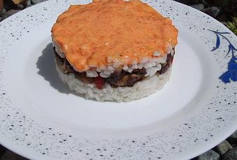 Ahora sólo queda montar el plato, podéis hacerlo echando el arroz en un plato, junto con las verduras, la morcilla y la salsa que más os guste o prepararlo tipo timbal como he hecho yo. He puesto un aro en un plato, colocamos una base de arroz blanco, otro de verduras y morcilla, más arroz blanco y coronamos con la salsa que más os guste, en este caso ali olí de pimientos de piquillo, que tal y como os explique es como una mayonesa añadiéndole ajo y los pimientos del piquillo.