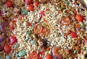 1- Calentar 4 tazas de agua on una rama de tomillo otra de romero una pizca de azafrán. Apagar cuando rompa a hervir y reservar.2- Limpiar los níscalos desgravar las habas tiernas. Limpiar y trocear el pimiento, la cebolla y el ajo. Lavar los tomates y cortarlos por la mitad.3- Saltear la cebolla, el pimiento y el ajo. Agregar los níscalos, las habas tiernas y los tomates cherry. Salar y añadir el arroz. 4- Cuando los granos de arroz tomen aspecto transparente verter la infusión caliente y llevar a hervor.5- Bajar el fuego y mantener a hervor suave, sin remover, durante 18 minutos. Apagar , tapar y dejar reposar durante unos minutos antes de servir caliente.