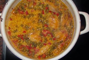 Ingredientes:- 200 gramos de arroz bomba (1 vaso).- 8 alitas de pollo.- Dos vasos y medio (de la medida del arroz) de caldo de pollo.- Un chorro generoso de vino blanco.- Medio pimiento verde.- Medio pimiento rojo.- Media cebolla.- 2 dientes de ajo.- Media lata de guisantes.- 2 cucharadas de tomate frito casero.- Una cucharadita de colorante.- Aceite de oliva virgen extra.- Sal.- Limón (opcional).