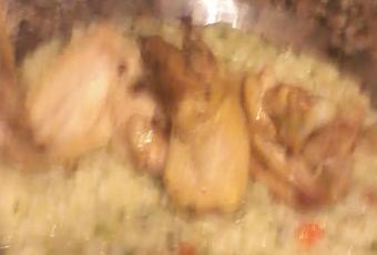 Las saltamos la cebolla bien picada junto al purro y zanahoria con roció vegetal y un pisca de sal . Mientras, cocinamos en microonda tapado 8' minutos al máximo, cogote y palas del pollo tapado con fil o con su pata