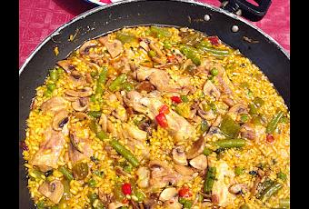 Lavar y cortar en trozos pequeños las verduras. Limpiar los champiñones y trocear.Salar el pollo.Poner aceite a calentar en la paellera y freír el pollo por todos sus lados. Añadir los pimientos y pochar unos minutos.Acontinuación, incorporar los champiñones y dar un par de vueltas.Poner los guisantes y el sofrito, remover para que quede bien mezclado.Añadir el arroz, rehogar y agregar el caldo de pollo caliente. Cubrir el arroz y un par de dedos por encima.Disolver unas hebras de azafrán en un vasito con caldo caliente y añadir al arroz.