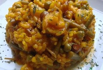 Hola de nuevo! He estado un poco ausente porque he tenido invitados en mi casa, pero ya estoy otra vez por aquí. Hace un tiempo tenía un par de patas de pulpo cocidas en el congelador y un manojo de ajetes y preparé este arroz. Salió riquísimo! Un besito para tod@s los que me leéis.- Preparar un sofrito con cebolla, pimiento verde, ñora molida y tomate pelado, todo picado. Añadir un chorro de vino blanco, perejil y una chispa de agua. Pasar por la batidora y poner en la cacerola. Echar el arroz con un poco de colorante y añadir caldo de pescado o de marisco hirviendo, según vaya necesitando. Al final, añadir un puñado de gambas peladas, 2 patas de pulpo cocidas y una latita de guisantes. Opcional: añadir un puñado de ajetes en el sofrito.