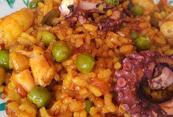 Y hoy, un pulpo es la mejor compañía para unos hermosísimos langostinos entre granos de arroz y chicharos, hecho en una paellera.