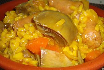 Cortar el tomate pequeñito y sin piel, agregar a la olla y dejar que se fria, incorporar las salchichas troceadas y dejar que se hagan un poco y enseguida echar las alcachofas en cuartos.