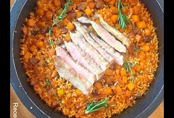 - Luego lo meto 10 minutos más al horno. 3 minutos antes de acabar pongo encima del arroz el trozo de secreto ibérico