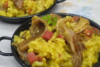 5- Añadir el arroz, caldo de carne o verduras, un poco más de colorante y sal, remover, válvula cerrada, menú guiso, 8 minutos, media presión, 140º. Despresurizar remover y dejar 5 minutos reposando.