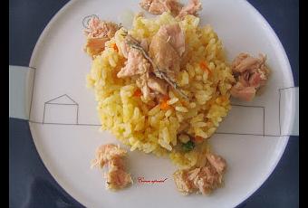 ELABORACIÓN EN THERMOMIX: verter un chorro de aceite y programar 5', varoma, velocidad 1.Introducir la zanahoria durante 7' velocidad 2, varoma. Luego la sal, el colorante, el romero, 4 tazas de caldo o agua y los guisantes (si son congelados o de lata, ponerlos los últimos 5 minutos), 6', velocidad 1, temperatura varoma. Una vez transcurrido el tiempo, poner las 2 tazas de arroz y programar unos 13-15 minutos (fijarse en las indicaciones del paquete) sin poner el cubilete, velocidad cuchara, giro a la izquierda y 100º. A falta de 5 minutos, incorporar las gambas. Vigilamos el caldo, por si hiciera falta añadir un poco más, así como rectificar de sal. Sacamos y dejamos reposar. Servir el arroz y el atún bien escurrido y mezclado.