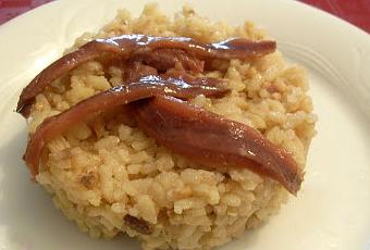 Cuando falten 5 minutos para terminar la cocción del arroz, añadir la pasta del mortero y remover para mezclar todo bien. Probar y rectificar de sal si hace falta. Apagar el fuego, retirar y dejar reposar 5 minutos antes de servir. Adornar con unas cuantas anchoas por encima.