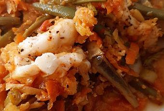 Mientras poner a calentar el caldo de verduras o agua con el azafrán, cuando hierva añadir el agua a la sartén donde están sofriéndose las verduras, dejar hervir unos 15 minutos antes de añadir el bacalao desalado y desmigado.