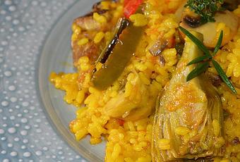 1/2 pimiento rojo1/2 pimiento verde1 tomate hermoso y maduro150 gr de setas1 manojo de ajos tiernosuna alcachofa300 gr de arroz bomba900 mililitros de agua o caldo400 gr de costillejas cortadas en trozos pequeños1 vasito de aceite400 gr de presa ibéricauna rama de romerouna rama de tomillo frescosalazafrán1 cucharadita de pimentón dulce
