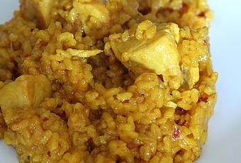 Ingredientes 300 gr. de arroz, dos pechugas de pollo cortadas en tacos, 3 ó 4 cucharadas soperas de pisto, 1 litro de caldo casero de pollo, azafrán, sal y aceite de oliva virgen extra.