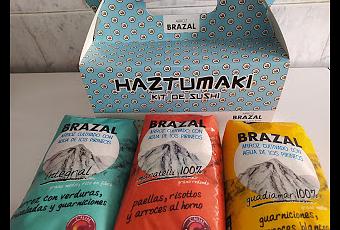 Tres paquetes de arroz de diferentes variedades. además del kit para prepararnos sushi casero, que contiene todo lo que veis en la segunda foto.