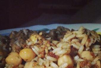 3. Añadimos garbanzos, salsa yakisoba y cebolla frita. Removemos bien y a disfrutar