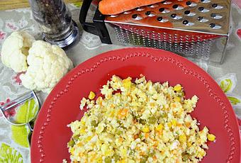 INGREDIENTES:- Arroz de coliflor.- Un bote de guisantes.- Un bote de maíz.- Un zanahoria.- 3 huevos.- Aceite de oliva.- Sal y Pimienta negra molida.