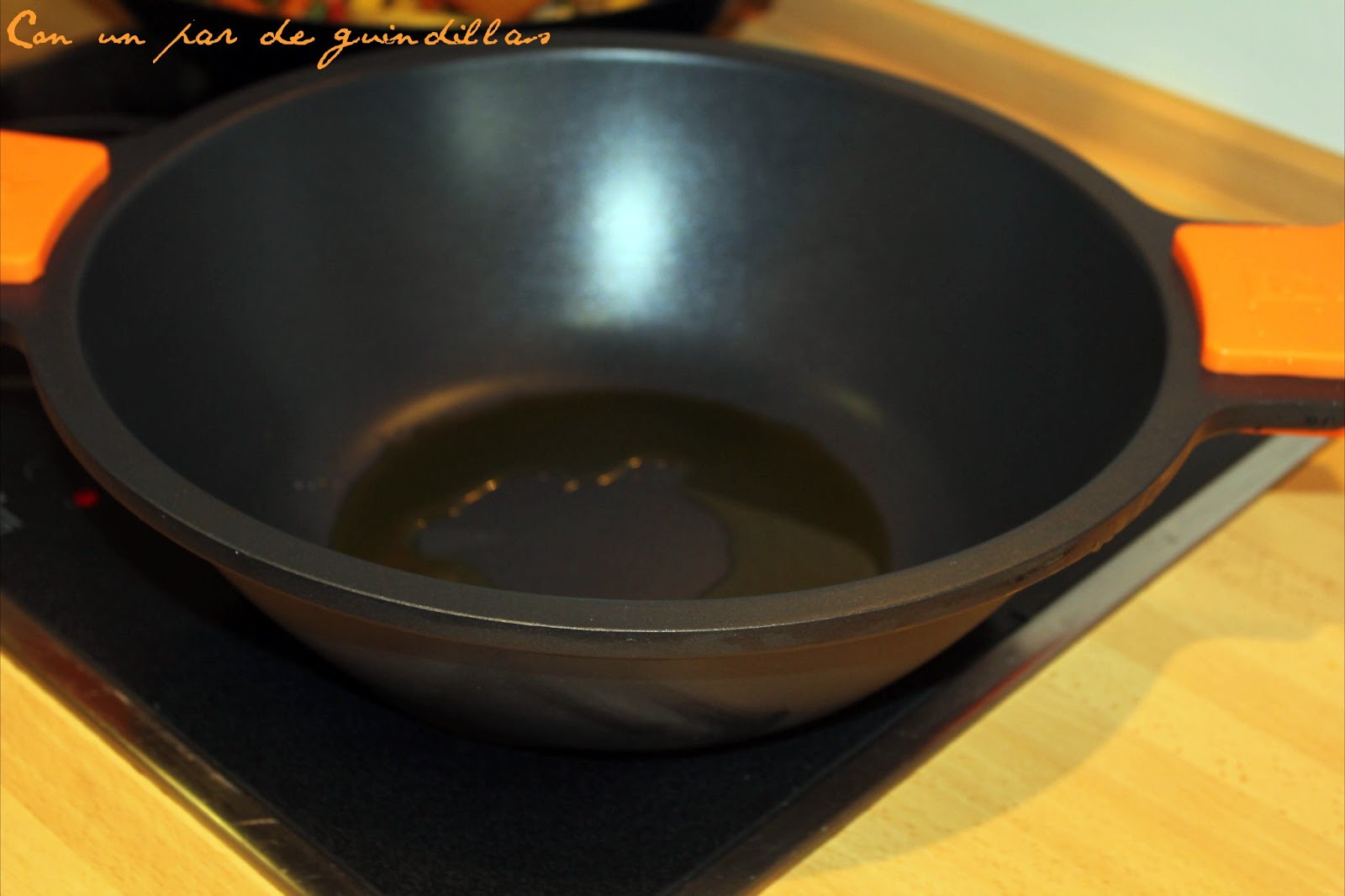 recetas de aire asiático, porque de veras que se ha puesto a ello.El wok es un instrumento de cocina típico en casi todo extremo oriente, sus altas paredes acumulan mucho el calor y se consiguen cocciones muy rápidas. Además, este wok es apto para todo tipo de superficies y al tener las mismas asas que la cacerola, de quita y pon de silicona, podemos también utilizarlo en el horno. Hoy vamos con un arroz al estilo tailandés o KHAO PAD con un pequeño sacrilegio porque utilizamos AOVE en lugar de algún aceite neutro, pero que queréis, así le damos nuestro toque mediterráneo.