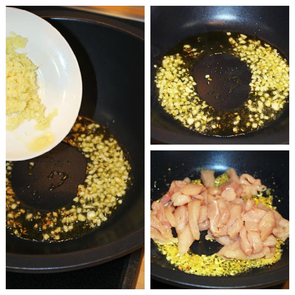 wok AOVE. Salteamos los dientes de ajo picados finos. Añadimos el jengibre rallado y removemos con