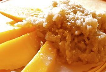 El arroz glutinoso hay que remojarlo en abundante agua, durante unas 12 horas como mínimo. Una vez remojado, se debe escurrir y lavar un par de veces, para eliminar un poco del exceso de almidón. Escurre y coloca en un cuenco o bol amplio. Cubre de nuevo con agua, lo justo para cubrir el arroz, tapa con un plato llano y cocina en el microondas a máxima potencia 10 minutos. Esta es la forma rápida. Si quieres se puede cocinar a la manera tradicional, al vapor puesto sobre una olla con agua, sobre un colador con una muselina o servilleta fina, dejando cocer 50 minutos.Una vez listo el arroz se deja reposar unos minutos, hasta que acaba de ablandarse.Mientras tanto calienta la leche de coco en un cazo de fondo grueso, junto con el azúcar de palma y una pizca de sal. Deja cocer, a fuego medio, unos 10 minutos, removiendo con frecuencia, hasta obtener una crema espesa.Vierte la crema sobre el arroz en el bol, lentamente. Remueve y deja reposar 20 minutos. Sirve templado en un plato acompañando de las rodajas de mango, regando con un poco de leche de coco y adornando con el sésamo. Este arroz glutinoso con coco y mangos, receta tailandesa, se puede servir templado o fresco.Fuente: pepekitchen