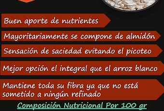 - Índice glucémico mas bajo que el arroz blanco, manteniendo los niveles de glucosa en sangre más estables.