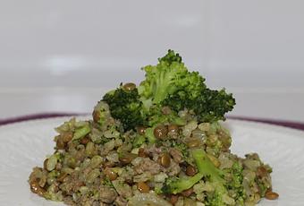 Cocer el brocoli y dejarlo al dente, ecurrir y reservar. Cocer el arroz junto con las lentejas, escurrir y reservar. En un wok o sartén echar un chorro de aceite de oliva y sofreir los ajos picados, añadir los piñones. Agregar la cebolla picada y pochar. Agregar la carne picada salpimentada y sofreir. Añadir un chorrito de salsa inglesa, dar unas vueltas. Espolvorear con el curry al gusto. Y Agregar el arroz con las lentejas y el brocoli, dar unas vueltas y listo.