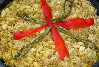 - Retiramos del fuego y yo lo tapo con un paño y lo dejo reposar 5 minutos antes de servir. Lo adorno con pimientos y trigueros.