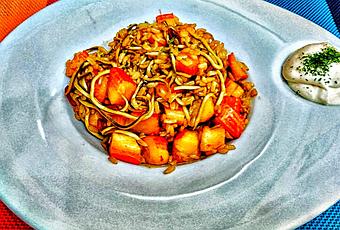 Ponemos una sartén al fuego con una gota de aceite y echamos los ajos laminados y sofreímos hasta que doren, añadimos la cucharadita de pimentón y mezclamos con el ajo para enseguida añadir las gulas y los palitos de cangrejo hechos trozos y los dejamos cocinar unos minutos, ponemos el arroz y salpimentamos al gusto, sacamos de la sartén y servimos, yo lo he emplatado en un plato de porcelana de la fábrica Porvasal.