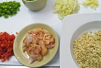 1º Deberemos cortar todas las hortalizas en brunoise ( cuadraditos pequeños, como se ve en la foto de los ingredientes) 2º Cortaremos el pollo en tacos de 1cm aproximadamente.