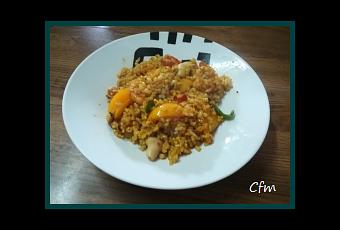 -300 gr de arroz integral ya cocido-300 gr de txipirones limpios y troceados-100 gr de gambas peladas-1 cebolla-1 diente de ajo-1 pimiento rojo-100 gr de tomate natural triturado-Aceite de oliva-1 cucharadita de pimentón