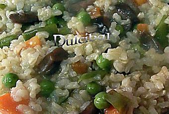 - 225 gr. de arroz integral SOS- 70 gr. de judías verdes (yo usé congeladas)- Una zanahoria- Media cebolla- 50 gr. de guisantes (congelados)- 100 gr. de setas variadas en conserva- AOVE (aceite de oliva Virgen Extra)- SalPREPARACIÓN:- Picar la cebolla, salar y pochar con un poco de aceite.- Trocear la zanahoria, las judías y las setas.- Incorporar la zanahoria y las setas a la cebolla, rectificar de sal y cubrir con agua.- Cuando empiece a hervir, incorporar el arroz, las judías y los guisantes. - Cocer hasta que se haya absorvido el agua, dejar reposar 5 minutos y servir.Nota: En el paquete recomiendan cocer el arroz durante 20 minutos, yo no sé si es que no estoy acostumbrada, pero lo tuve una media hora porque para mi gusto antes aun estaba un poco "duro".¡ A disfrutar comiendo sano !