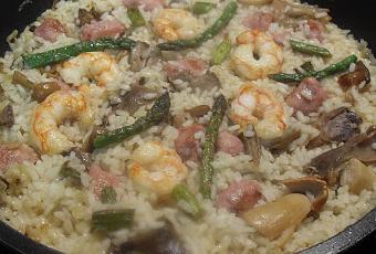 La cocción son unos 20 minutos, 8 minutos antes de finalizar, añadir las gambas, las setas y los espárragos, remover, el arroz queda algo seco, pero eso va a gustos. Importante, sobre todo respetar el tiempo que no se pase el arroz, y reposar 5 minutos fuera del fuego.