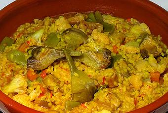 Ponemos un poco de aceite en una olla y esperamos que este caliente, añadimos el pollo que lo tenemos bien troceado, salpimentamos un poquito y la sofreímos hasta que esté bien dorada, añadimos el ajo picado, la cebolla y el pimiento, removemos muy bien y cocinamos unos minutos, añadimos el vino y dejamos cocer unos 3 a 4 minutos hasta que evapore el alcohol, añadimos la alcachofa, la judía verde y la zanahoria toda la verdura bien escurrida, cocinamos unos minutos y añadimos el tomate rallado, removemos muy bien y cocinamos unos 7 minutos a fuego medio, añadimos el pimentón dulce y rápidamente removemos y añadimos el agua (según la cantidad de arroz que vayamos a preparar le pondremos aproximadamente 4 veces la cantidad de agua que de arroz al inicio de la cocción) dejamos cocer a fuego medio durante unos 15 a 20 minutos, cuando añadimos el agua es el momento de añadir el caldo concentrado si así lo deseamos.