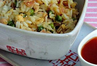 - En un bol o sartén amplia, dorar con un chorrito de aceite vegetal el pollo escurrido de su caldo, 1 cebolla y 2 dientes de ajo, todo picado. Cuando esté pochado, añadir ¼ kg. de gambas peladas, 100 grs. de jamón york picado, una latita de brotes de soja y una latita de guisantes cocidos, bien escurridas. Saltear todo junto unos minutos, añadir el arroz, el huevo cuajado y el líquido de macerar el pollo. Saltearlo todo bien y servir con salsa agridulce.