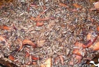 - 1Kg de chocos o sepias- 5 tacitas de las de café de arroz- 6 tacitas de las de café de agua- 1 cebolla mediana- 2 dientes de ajo- 3 cucharadas soperas de aceite- 2 sobres de tinta de calamar- salPreparación: