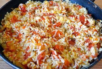 Sea como fuere, esta receta de origen griego es bien simple y da como resultado un arroz muy útil para guarniciones, con unos discretos toques aromáticos (que se pueden incrementar usando arroz basmati o jazmín, por ejemplo) y con una textura especial, gracias a la melosidad que le confiere el tomate de bote y el "crunch" de los piñones tostados.