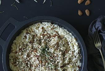Ingredientes:- 320 g de arroz largo.- 1 ramita de romero.- 200 g de dados de bacon ahumado.- 1 cebolla mediana.- 2 dientes de ajo.- Un buen puñado de almendras crudas de Aperitivos Medina.- Perejil picado.
