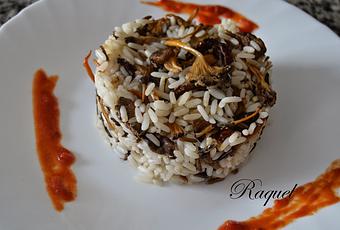 2 tazas de Arroz salvajeUn puñado de setas deshidratadas (Camagrocs)Dos dientes de ajoChileAceite de oliva virgenUna hoja de laurelSalPreparación:En primer lugar ponemos en un cuenco las setas con un poco de agua para que se hidraten, removiéndolas de vez en cuando, veréis que dobla o triplica su tamaño .Ponemos una olla con agua, sal y la hoja de laurel y hervimos el arroz el tiempo que marque el paquete.En una sartén ponemos un poco de aceite de oliva y freímos los ajos a trocitos pequeños, cuando empiecen a coger color echamos las setas que habremos escurrido bien.