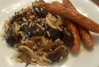 Mezclar las setas, los champiñones y la cebolla con la mezcla de arroz y rehogarlo todo junto un par de minutos. Servir el arroz acompañado de las salchichas. Se puede acompañar con alguna salsa de soja o Teriyaki.