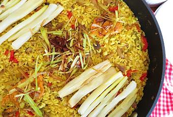 5 Minutos antes de terminar el arroz, poner encima los calçots asados reservados, para que cojan temperatura.