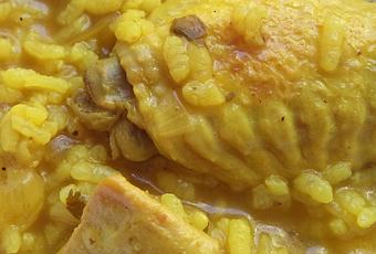 Es una arroz muy especiado y terriblemente delicioso. Las especias principales son el curry y ras al hanout, una mezcla de especias que suelen utilizarla en la cocina marroquí.