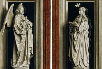 VAN EYCK, Jan. Díptico de la Anunciación. Izquierda: Arcángel San Gabriel. Derecha: La Virgen María. Ca. 1433-1435. Óleo sobre tabla, técnica de la grisalla. Madrid, Museo Thyssen-Bornemisza. Inv. 137.a-b (1933.11.1-2).