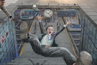 Se trata de Julian Beever, británico, especializado en una técnica llamada anamorfosis, que crea una ilusión óptica según la perspectiva desde la que contemples el dibujo, dando imágenes en tres dimensiones que parecen reales...