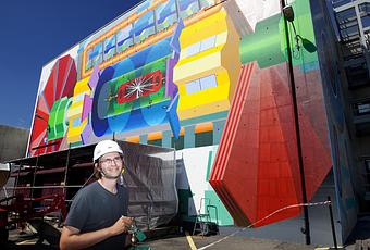 El artista estadounidense Josef Kristofoletti, ante el mural del ATLAS en el CERN. Foto: Claudia Marcelloni (CERN). (clic para ampliar)