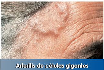 La arteritis de células gigantes produce inflamación en el recubrimiento de las arterias, muy a menudo en las arterias de las sienes. Los signos y síntomas incluyen dolores de cabeza, dolor en la mandíbula, problemas de visión y sensibilidad en el cuero cabelludo. Si no se trata, esta enfermedad puede provocar un accidente cerebrovascular o ceguera.