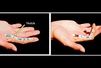 - Protuberancia sensible en la palma de la mano en la base del dedo.