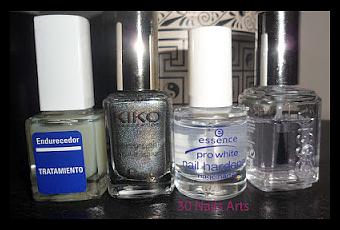 Base endurecedora de DELIPLUS, pro white nail hardener de ESSENCE, 400 Holográfico KIKO, good to go de ESSIE