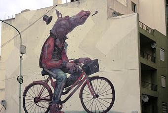 ARYZ has been in Buenos Aires (Argentina) to participate in the Meeting Of Styles. His job this time has been a great horse riding a bicycle in the facade of a 5-storey building in San Telmo.
