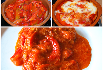 El caso es que, no hace mucho, la suegra de mi hermano (que además es una buenísima cocinera) me comentó que ellos lo tomaban caliente y la manera de hacerlo también era diferente.Total, que no dudé en pedirla que me escribiera la receta, y hoy la comparto con vosotros porque, de verdad, es un plato que está riquísimo!! Ya tengo asadillo "temporada primavera-verano" y asadillo "temporada otoño-invierno" (jua jua..)Ingredientes:3 o 4 Pimientos rojos de los gorditos1/2 diente de ajoAceite de olivaComino2 huevostomate fritoperejilvinagreSalPreparación:Asamos los pimientos en el horno. Cuando estén listos quitamos la piel y los vamos poniendo en tiras en una fuente, preferiblemente de barro, en la que antes habremos puesto en el fondo 3 cucharadas soperas de tomate frito.Colamos el líquido que nos ha quedado de los pimientos una vez asados y lo incorporamos a la fuente.Pelamos 1/2 diente de ajo y lo ponemos en un mortero junto con el comino (a gusto de cada cual) y el perejil. Lo machacamos bien. Ponemos aceite de oliva hasta la mitad del mortero y sal. Lo mezclamos muy bien y lo echamos encima de los pimientos. También añadimos 1/2 vaso pequeño de agua. Ponemos al fuego y dejamos que hierva unos 15' a fuego lento.Batimos los huevos, les echamos un chorrito de vinagre y lo vertemos en la fuente o cazuela. Lo vamos moviendo con cuidado hasta que cuaje.Ésto y una barra de pan y los reyes del mambo ¡¡os lo digo yo!!