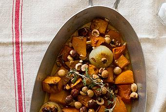 - Horneamos 20 min a 180ºC. Pasado este tiempo, sacamos del horno y añadimos por encima las avellanas toscamente picadas. Introducimos otra vez en el horno y seguimos asando unos 10 min más o hasta que veamos las hortalizas bien asadas. Servimos caliente.